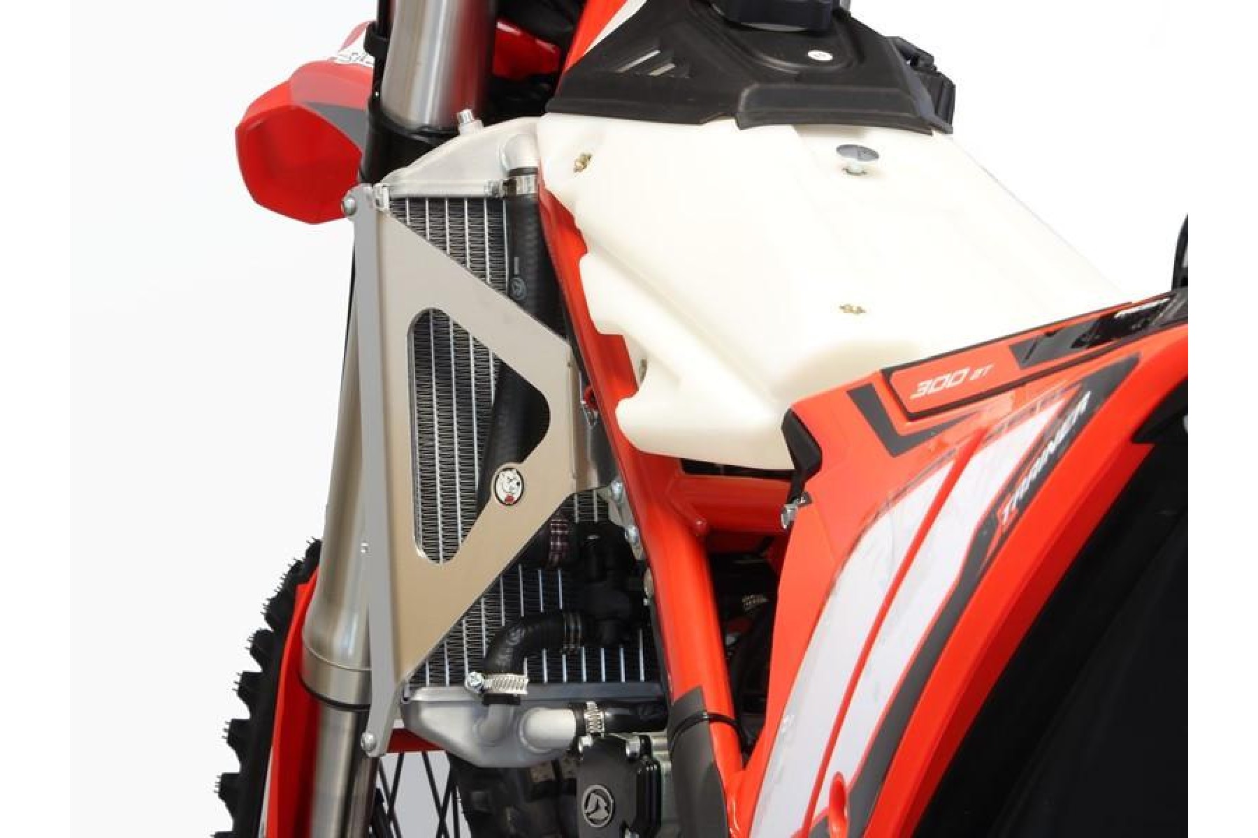 Beta 250 / 300 Xtrainer radiator guards. Weight: 1,0Kg. Made of aluminium 4mm thick, protections form a real cage around the radiators with an additional fixation point against the frame to reinforce the resistance in case of fall. This products allow to use the OEM air deflectors without any modification. WARNING, does not fit on all model years