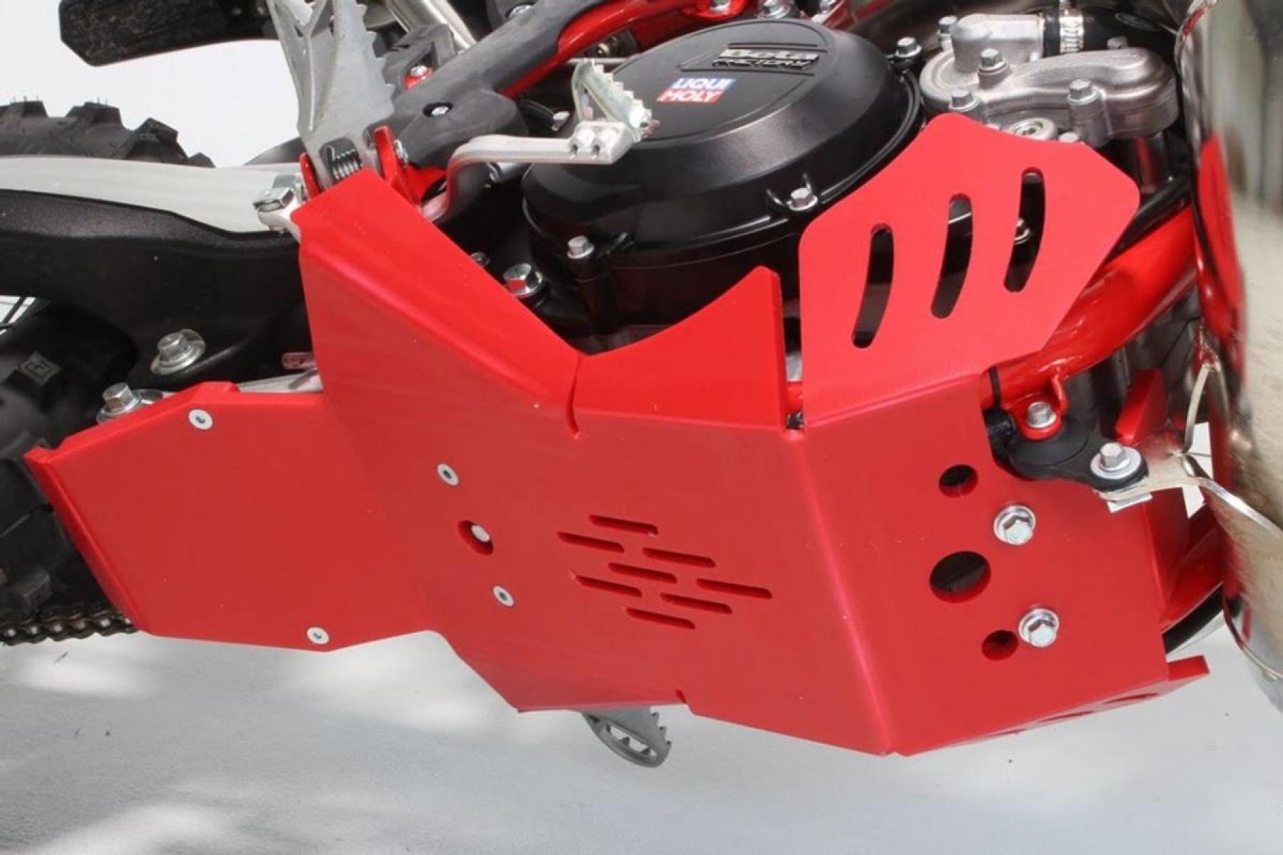 New design is dedicated to EXTREME Enduro racing, New design has added coverage to protect the frame's tubing and full linkage protection. Made from 8mm thick HDPE Polyethylene which is 40% lighter than aluminium and this helps to reduce vibration and "Rattle" The AXP Racing process allow to absorb heavy impact better than basic injected plates.